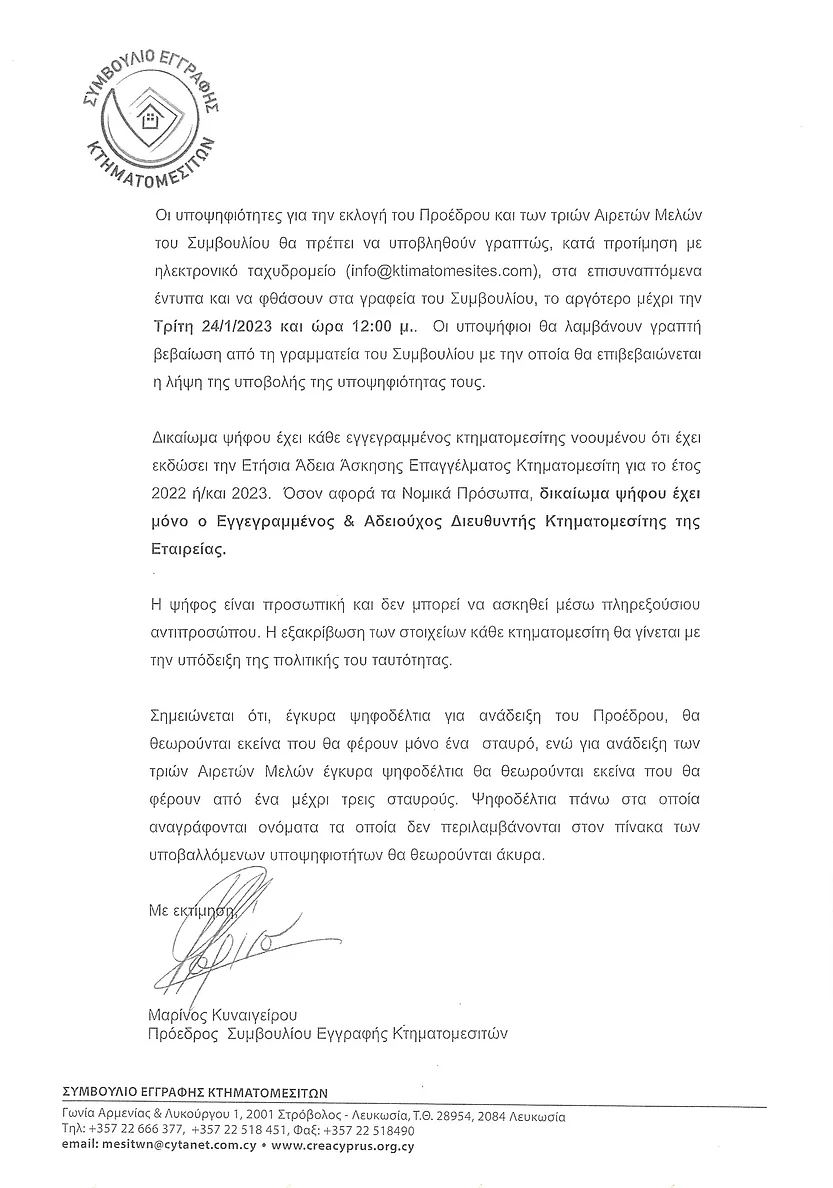 Σας προσκαλώ να εξερευνήσετε την ιστοσελίδα μας για περισσότερες πληροφορίες σχετικά με τις υπηρεσίες μας, τις δραστηριότητές μας και τα οφέλη που προσφέρουμε στα μέλη μας. Είμαστε εδώ για να σας στηρίξουμε και να προωθήσουμε την ανάπτυξη του κτηματομεσιτικού τομέα στην Κύπρο.